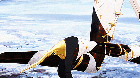 But it’s heavy and painful. Phos’s legs and the rest of their body struggle to bear the weight, and with each step Phos’s body cracks. And the gold fills in those cracks to mend them. And it leaks from their eyes. It hurts, and it hurts, but Phos pursues the Lunarians to hurl a sword at them before they can get away. But it falls short, as Phos has acted just too late. Antarcticite is gone. (Symbolism note: Kintsugi is the Japanese art of repairing broken pottery by mending the areas of breakage with a lacquer dusted or mixed with powdered gold, silver, or platinum. The philosophy behind it is that it treats the repair as part of the history of an object to be embraced and celebrated, rather than to disguise it.)