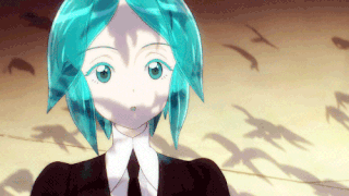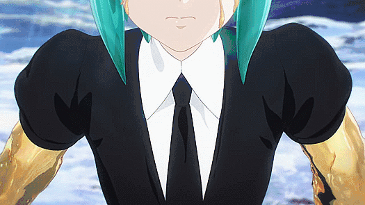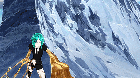 With their mentor, Antarcticite, Phos goes in search for any non-integrated phosphophyllite that can be used to forge new arms (there isn’t any). Resigned to use anything that might work, gold and platinum alloy is chosen and placed into Phos’s arm sockets. The reaction is a bizarre fluidity not before seen by other gem material, as gold is very soft and malleable. It is then that the Lunarians attack. Phos’s subconscious desires take over at first as connections are forming, and the golden arms surround Phos safely in a small, thick golden box. After fighting off the Lunarians, Antarcticite tries to help Phos out of the box, only to be shattered by an attack from a second wave.