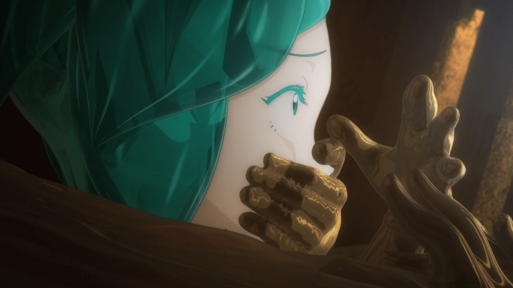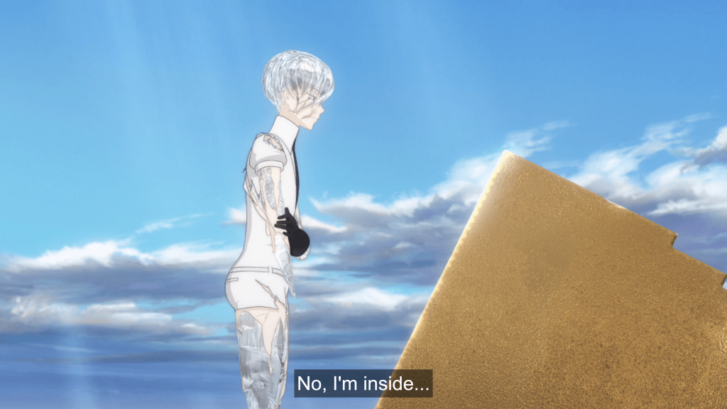 In this moment Phos has options to take. They can stay with the comfortable, easy subconscious actions of the new golden arms, which are now gagging Phos to keep them quiet to stay safe. After all, the Lunarians are passing by as it would be too much of a hassle to get to Phos. Or they can do something. Phos musters the courage to overcome their subconscious and the confines of the safe but imprisoning cube, causing it to morph into a blossoming lotus (largely symbolizing rebirth in Buddhist culture, from which a lot of symbolism in this show is taken) before absorbing into Phos as arms and enabling them to act.
